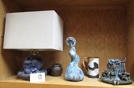 Circulation Desk Shelves: Pottery by The Gallery of Ocean Shores. Lobby: Doll collection from Carol Haugen.
