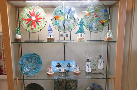 December 2025 - Kids Bulleting Board: “Treat Yourself to a Good Book!” Lobby: Glass Art by Serry Barnes. Circulation Desk: Pottery by Jamie Scarth.