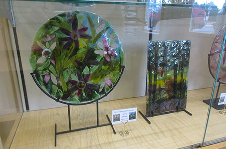 August 2025 - Lobby: Woodworking pieces such as cutting boards cribbage boards, and puzzles by Skip Radcliffe.