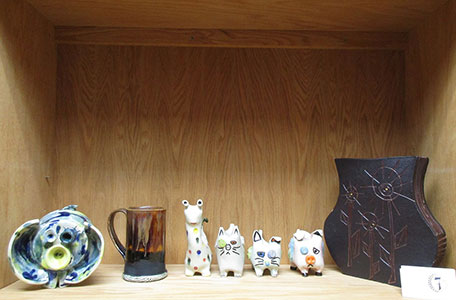 Circulation Desk Shelves: Pottery by The Gallery of Ocean Shores. Lobby: Doll collection from Carol Haugen.