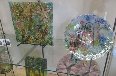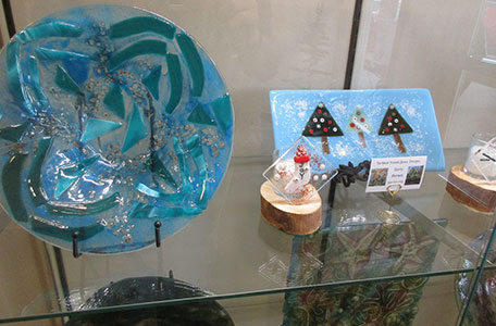 December 2025 - Kids Bulleting Board: “Treat Yourself to a Good Book!” Lobby: Glass Art by Serry Barnes. Circulation Desk: Pottery by Jamie Scarth.